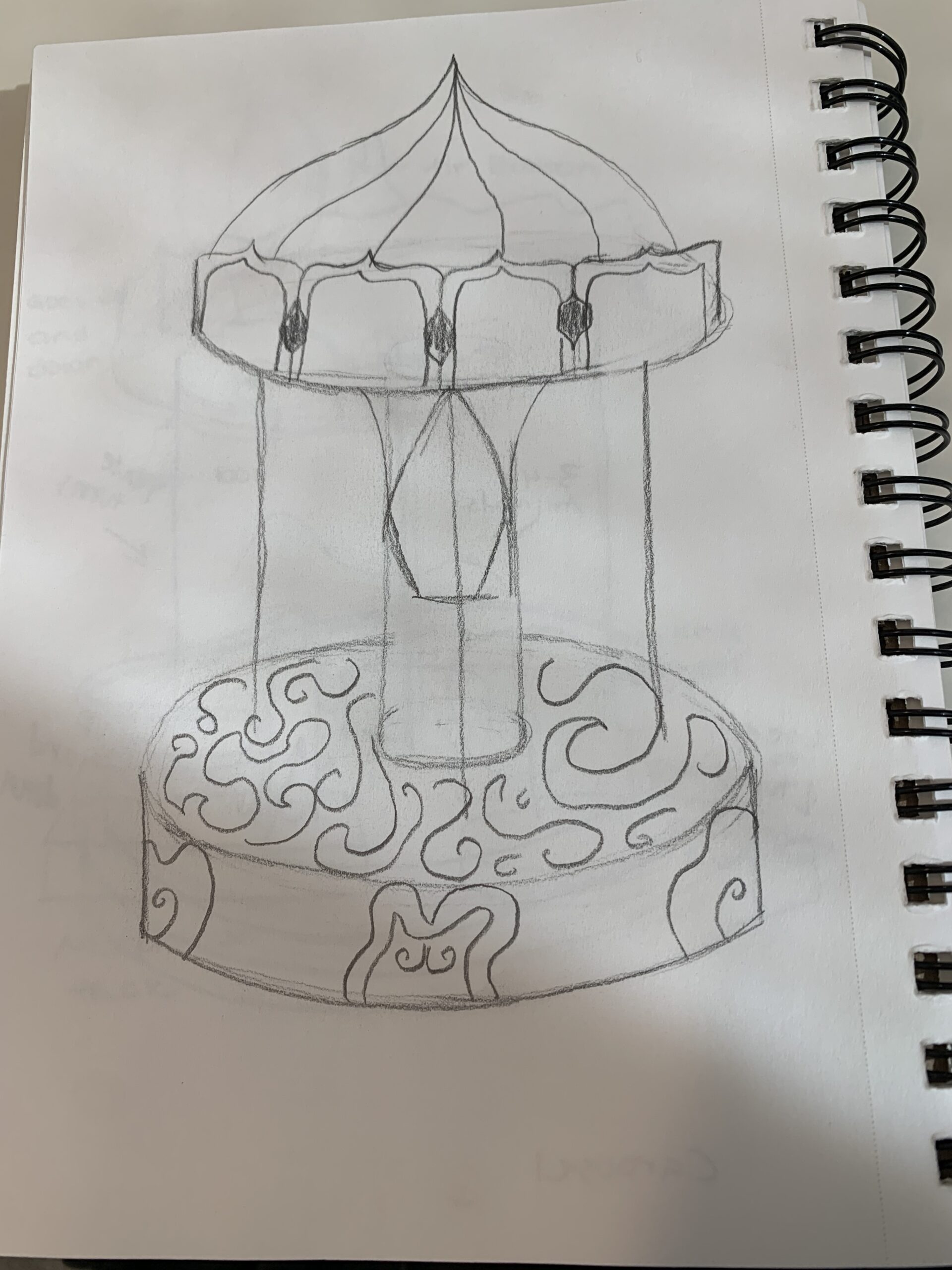 During the initial ideation phase, I created multiple drawings in a few different aesthetics to get the idea of how I wanted my carousel to look. I considered some of the functional aspects, but mainly focused on the aesthetic of the project.