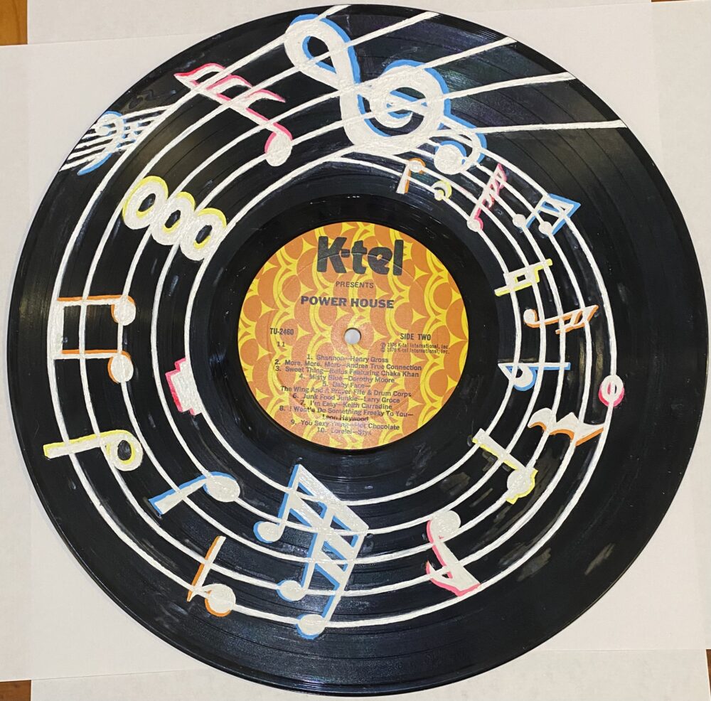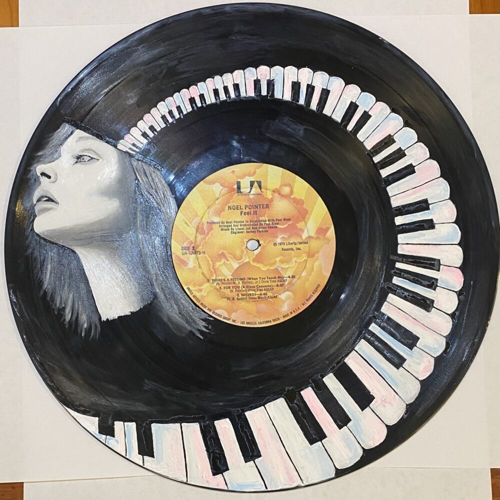 I worked with mediums that I am super comfortable with to start. I used acrylic and oil paints for the paintings on the records. Although I stuck mainly to skills I already possessed, I also learned new ones with this project. Before this I had only really used things like stretched canvas and wood for my paintings. Learning to paint on the vinyl canvas material was a new skill for me. It was a different experience to things I have done in the past, but it taught me that working with new materials can be fun and result in great final products. It also taught me that I can branch out to new canvas materials, and how to deal with the challenges that come with that.