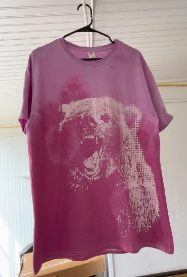 Recently my favorite color has been mauve. It is a light purple/dark purple and actually a really interesting lesson on color theory if you look it up. To get that color/look I went with using blueberries as my base color and then when cooking down my berries to make a deeper color using strawberries and another berry mix with blackberries and raspberries. Next I decided with my limited amount of color changing pigment and not the closest colors to what I thought the blueberries would be, I decided to make my graphic the part that changes color instead of the whole shirt. To do this I luckily already have screen prints that I create for myself/selling and decided to go with white fabric dye that I could add the pigment to. While doing this I had some issues as the fabric dye didn’t take the exact color of the pigment but I was able to get 3 colors. A pink to white color changing, a green to white color changing, and a bluish to white color change. At first I did not think the color changing would work at all and I wasn’t able to see a change after doing my prints. That was until I got the graphic wet and could immediately see that the color change actually works really well and is super fast reacting.