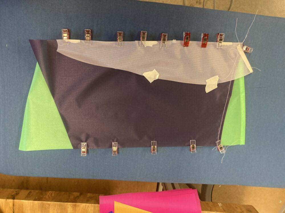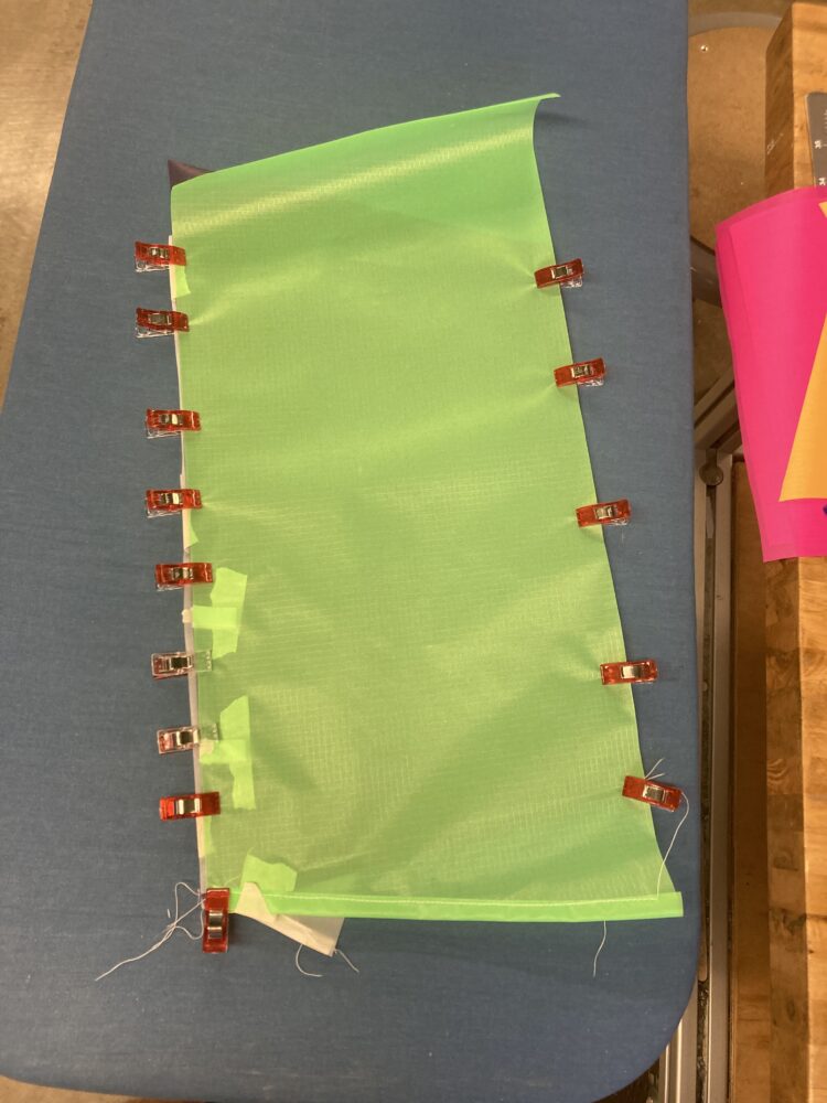 At each seam there were two colored panels and one profile with the bridle loops taped in place on one of the panels. These stacks proved to be slippery but with lots of clips generally stayed in place for sewing. I also used masking tape to hold pieces of fabric together that were not being held in place with clips well.