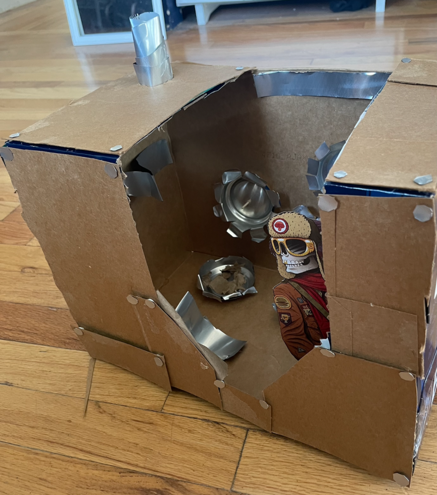 Starting with my upcycle project, I made a steampunk aesthetic box out of old beer boxes and cans. My goal for this project was to create a dynamic piece that matched the steampunk aesthetic, using the most simple materials possible. I believe that despite clear challenges, I managed to hit the intended aesthetic, as well as creating semi functional gears out of old cans. At one point I had the gears working smoothly, and then when I ran down my stairs to show my roommate I tripped and fell directly on my box, destroying all of my progress and forcing me to start over. I overcame this hiccup well but could not get the gears working as smoothly again. In order to match the steampunk aesthetic, I cut small pieces of can and attached them to the outside of the box over top of covering made from other boxes. This method helped me attain the steampunk aesthetic well. I also cut out a character from a Voodoo Ranger box and put him in the foreground of my piece, and put him on his own can that could rotate. There was also a few other elements included on the inside that helped me match my aesthetic. Below are links to my upcycle posts as well as a few pictures of my final result.