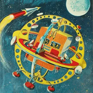 Rising to popularity during the early days of the Space Race. Raygun Gothic represents a popular art aesthetic from the 1940s – 1960s. It commonly contains bright, distinct colors similar to those found in comic books, depicting a science fiction-esq “Traditional American” future. Artistic works often include a bright and optimistic outlook on the future being depicted. This aesthetic has been the inspiration for many iconic TV shows such as The Jetsons and Star Trek, as well as popular songs like Intergalactic by the Beastie Boys. This aesthetic was a product of optimism towards the future of spaceflight, that unfortunately never quite became a reality.