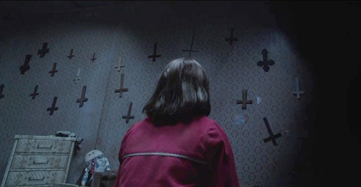 This still is from The Conjuring 2, where the family being haunted has hung up crucifixes around the room with the most activity, but something has flipped them over, instead mocking Christ.