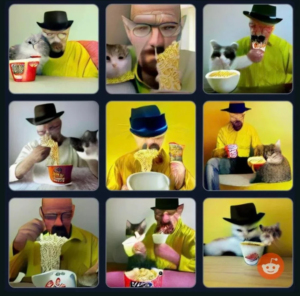 “Heisenberg eating instant noodles with a cat” (~2021) generated with DALL-E. user unknown