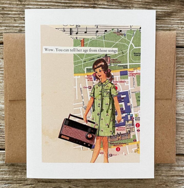 I would define the paper collage aesthetic as maximalist, vintage, retro, or natural. The maximalist vibe comes from having a lot of items pasted on a surface together – there’s plenty of things for your eyes to follow. The vintage/retro aesthetic comes from the materials used in the collage. If it’s a postcard from the 60s, or an old newspaper, or a magazine containing film photos, it will likely give the card a vintage/retro style. I mention a natural, earth-tone aesthetic because many upcycled or recycled materials are not stark white or fresh-out-of-the-factory feeling. Brown paper bags and torn-up, wrinkled materials with organic edges and textures create this aesthetic. Many collages can also feel nostalgic and whimsical, like a storybook.