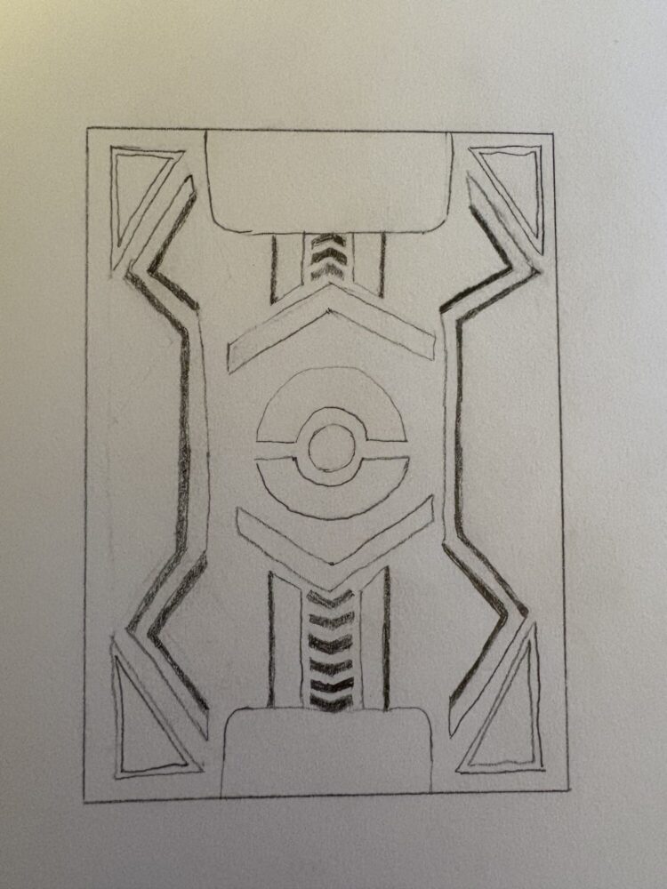 After sketching the initial design on the front of the Pokémon TCG deck box, I decided to start modeling the actual box within SolidWorks. I focused on making sure I had enough material to make a box. The main dimensions I went off of are the dimensions of a Pokémon card, which are 2.5″ by 3.5″. The internal depth I got from an existing deck, about 0.85″. These are the internal dimensions I used to model the box. I added the hourglass shape to enhance the decorative design that will be going on the flat side.