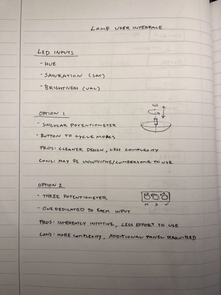 I’m super excited to see the result of this project, Arjun! I am impressed with your sketching and your willingness to dive into multi-faceted electronic components. You noted in your user interface sketches that the singular potentiometer option may be less intuitive for users – do you have any plans to print “knob” details or subtle usability notes on your final 3D model? Looking forward to the fully assembled result!