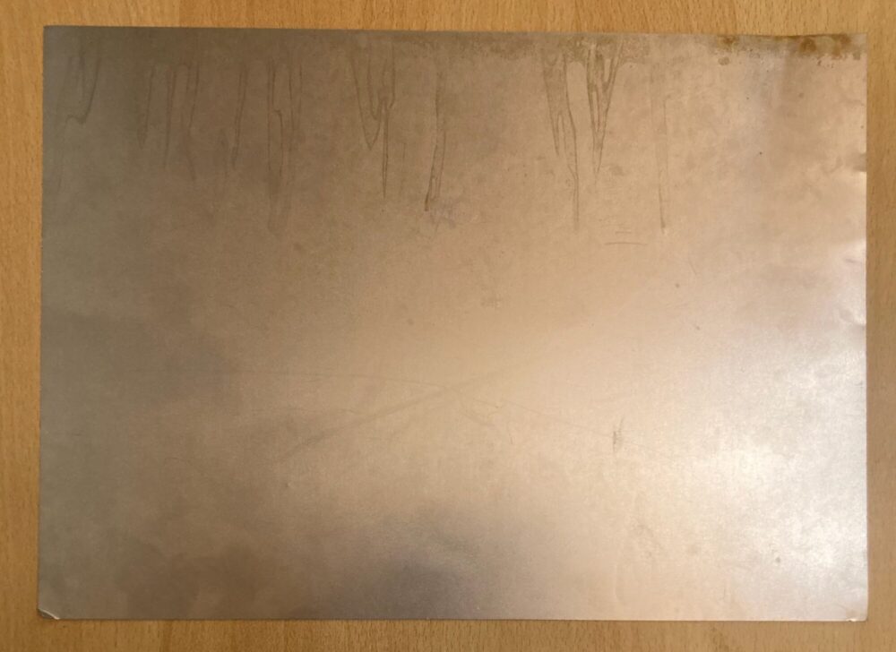 As described last week, and shown within the title image, there are five key components I need to get in some form to put together a Holmes stereoscope: a faceplate, a shroud, a divider, a beam, and a stereogram holder. From the first materials gathered image, I plan to use the large bracket as the beam, the circuit board as the divider, and the smallest clips on the stereogram holder as the mechanism to secure the stereogram card. The faceplate, shroud, and stereogram holder base I plan to cut and bend out of the thin piece of sheet metal in the second material gathered image. The underside of the short side of the large bracket has a slot that a piece of sheet metal can securely slide within, which will enable the stereogram holder to be adjusted closer and farther as needed for the viewing focal length. The rest of the components will be used as needed for details on the stereogram for the cyberpunk aesthetic. I also considered the water stain present on the sheet metal and can either use or avoid it depending on which sections I cut from, but I think including it could add to the salvaged nature of the cyberpunk aesthetic.
