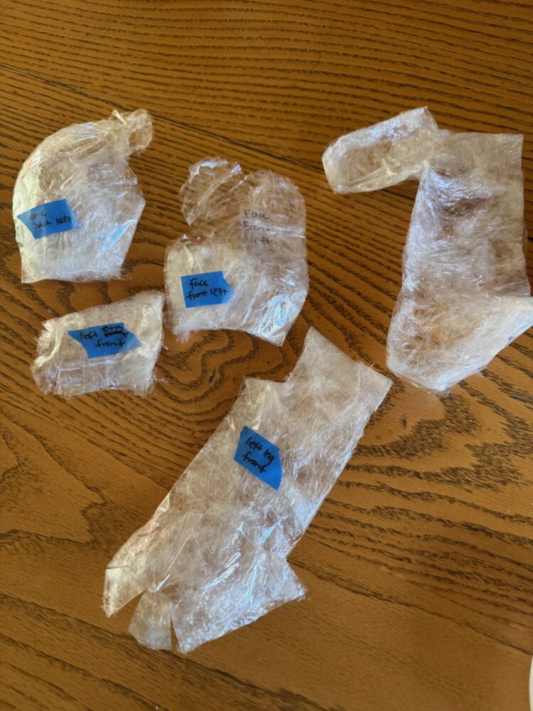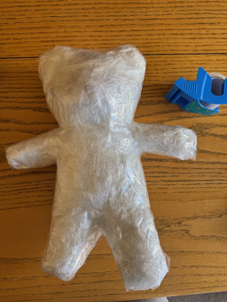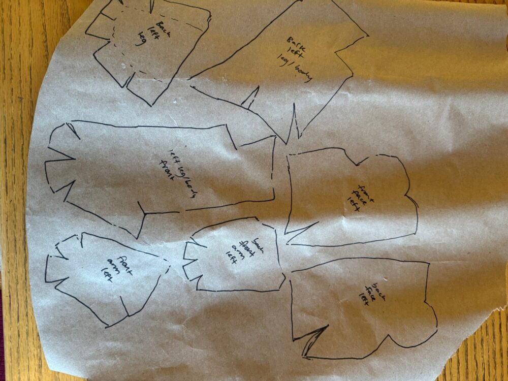 I am focusing on my personal stuffed animal, which I will be recreating from fabric. I started making a pattern by covering the bear with saran wrap, and then covering the saran wrap with packing tape. I cut off that “form,” hacked it up, and added darts to make everything lay flat. I then traced these shapes onto butcher paper to create an actual pattern. I sewed half of the face to test it, and I think it will work decently well.