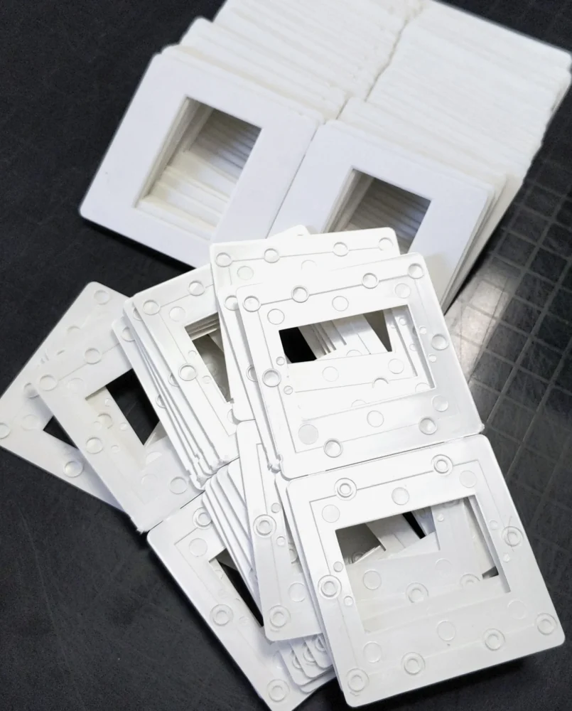 For the “film” to put in the frames, I wouldn’t take photos or use actual film. Instead, I would use solid-colored acetate, potentially even just gray or neutral tones in every slide. Replacing the meaningful images with solid colors makes a different artistic statement than what I want to convey. To get a bit philosophical, it might suggest that whatever images were there hold no meaning. It would create an almost eerie feeling seeing the blank film, rather than the cozy feeling I intend to nurture with a wide variety of interesting photos.