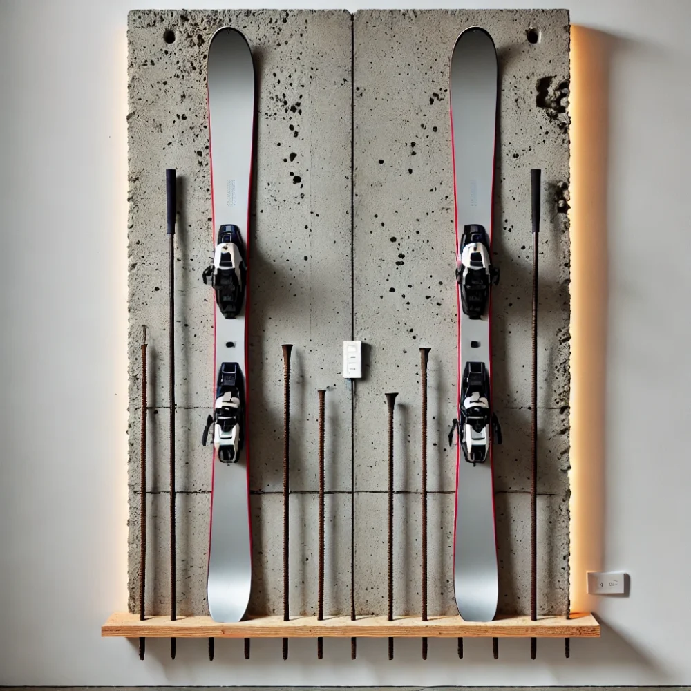 To hold the skis, I would use two u-shaped rebar stakes, passing through the concrete pad. To fasten them, I could weld them to a piece of steel bar stock and fasten that between the french cleat and the concrete pad. I would use small pieces of clear vinyl tubing to protect the edges of the skis. As a last element, I might include some variation of LED backlighting between the wall and the concrete pad.