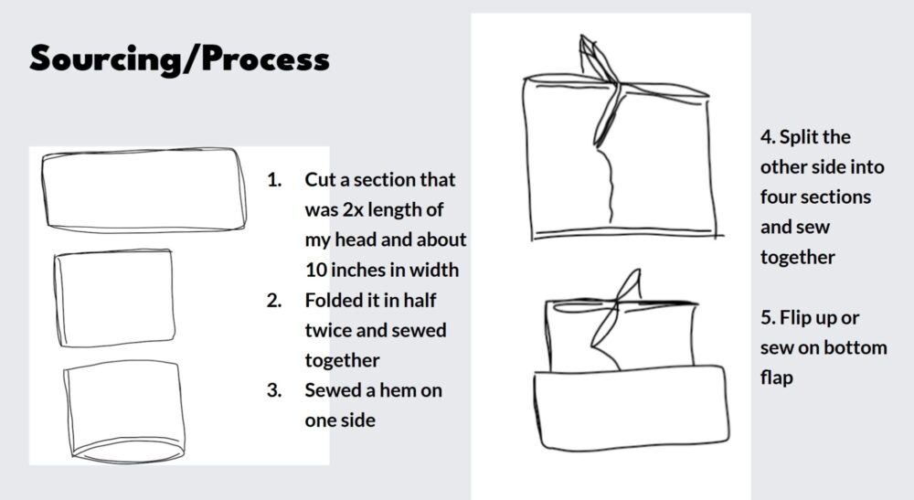 - I cut the pattern into a long rectangle. One end was 2x the length of my head plus 1-2 inches for seam allowance. The width was around 8 inches.