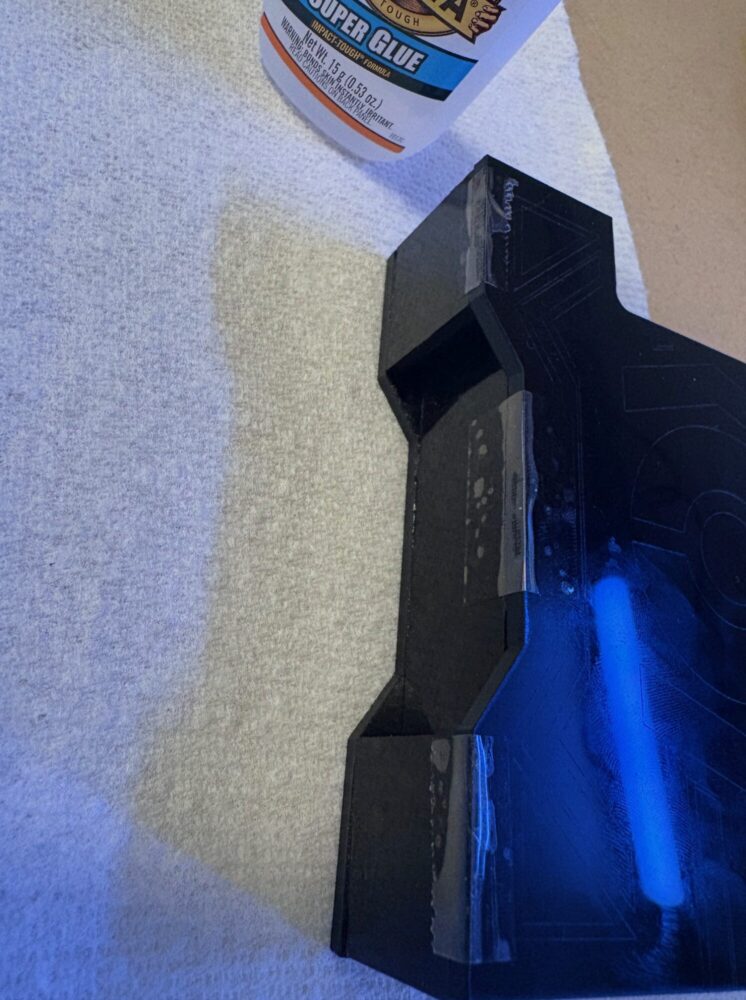 To put the box together, I used clear tape to hold each panel together. With a dab of CA glue, the shape held together enough to remove the tape and glue the rest of the box together.