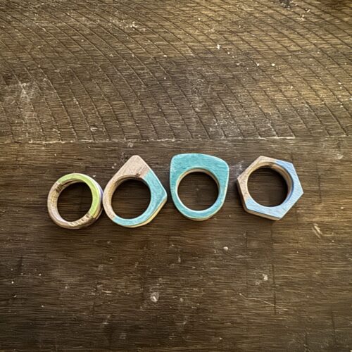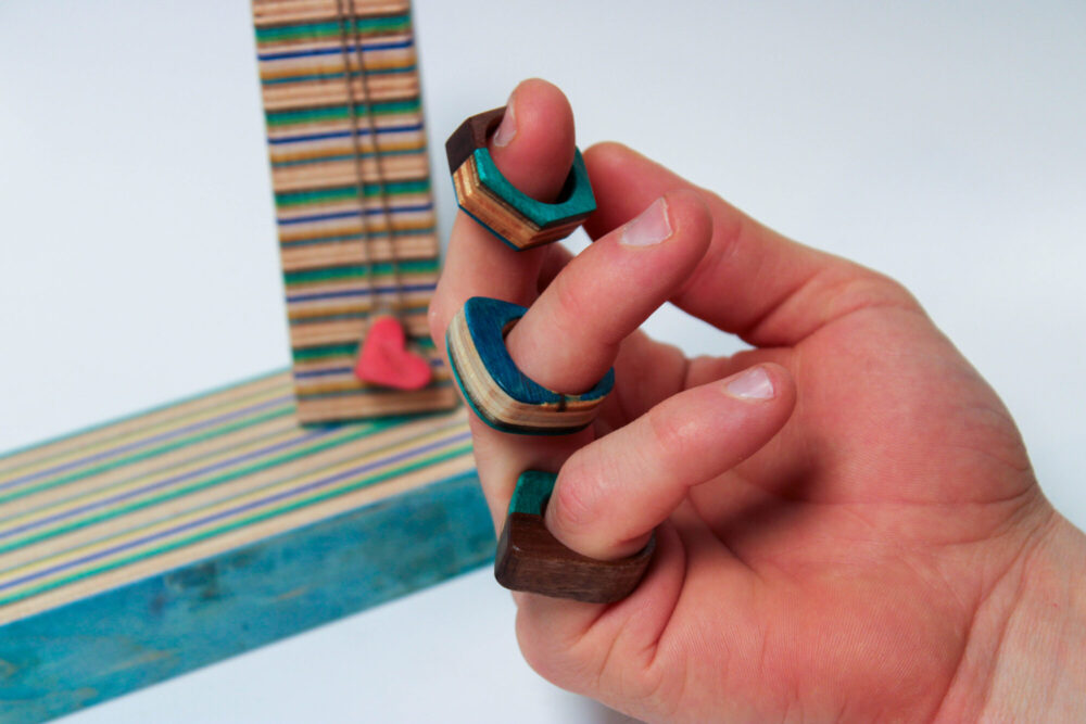 Hi Matt, your skateboard rings are super cool! I really like how you explored different forms/shapes with your rings, and your documentation photos are looking very professional. I really like the asymmetrical curve-top one and think you nailed the Bauhaus aesthetic overall. Would you ever consider doing some small engravings with a Dremel (or something similar) to reveal even more from the layers? Either way, I’m excited to see if you sell these soon!