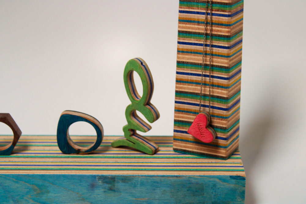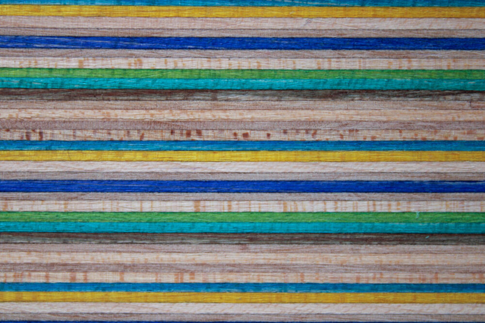 One of the most exciting aspects of working with skateboards is the variety of color layerings unique to each deck. Skateboards are constructed from multiple thin veneers of wood, each dyed in different hues. Sanding down the decks reveals, multicolored layers.