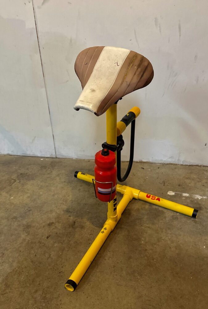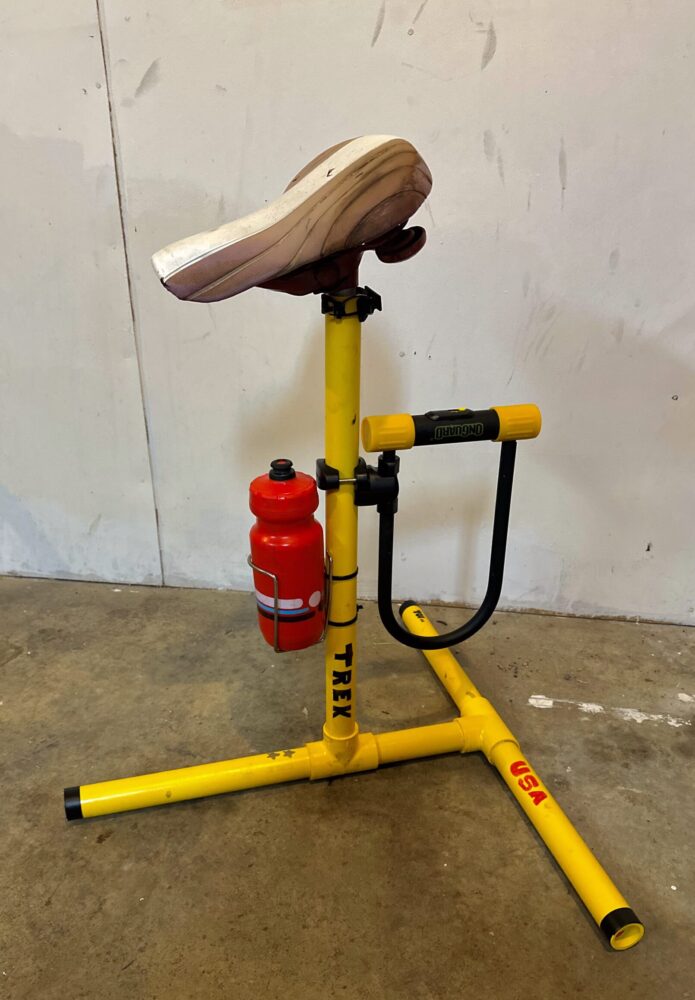 The frame was designed with an anticipated 20-inch height center frame and 3 ‘legs’ coming out from 90 degrees from the base, using simple PVC fittings from Home Depot. The decoration could begin after the pipes were cut and glued together using a purple primer and then a specialized PVC cement. A coat of yellow spray paint was added, along with other smaller decals that were hand drawn on, such as the ‘TREK’ logo and other messages found on bikes of the time. I salvaged a water bottle holder from another road bike and attached it with black zip ties along with a spare U-lock I had.