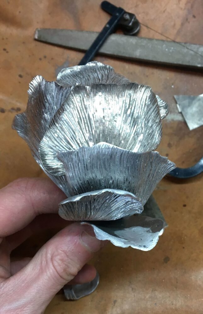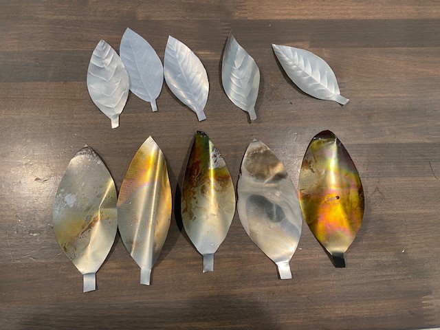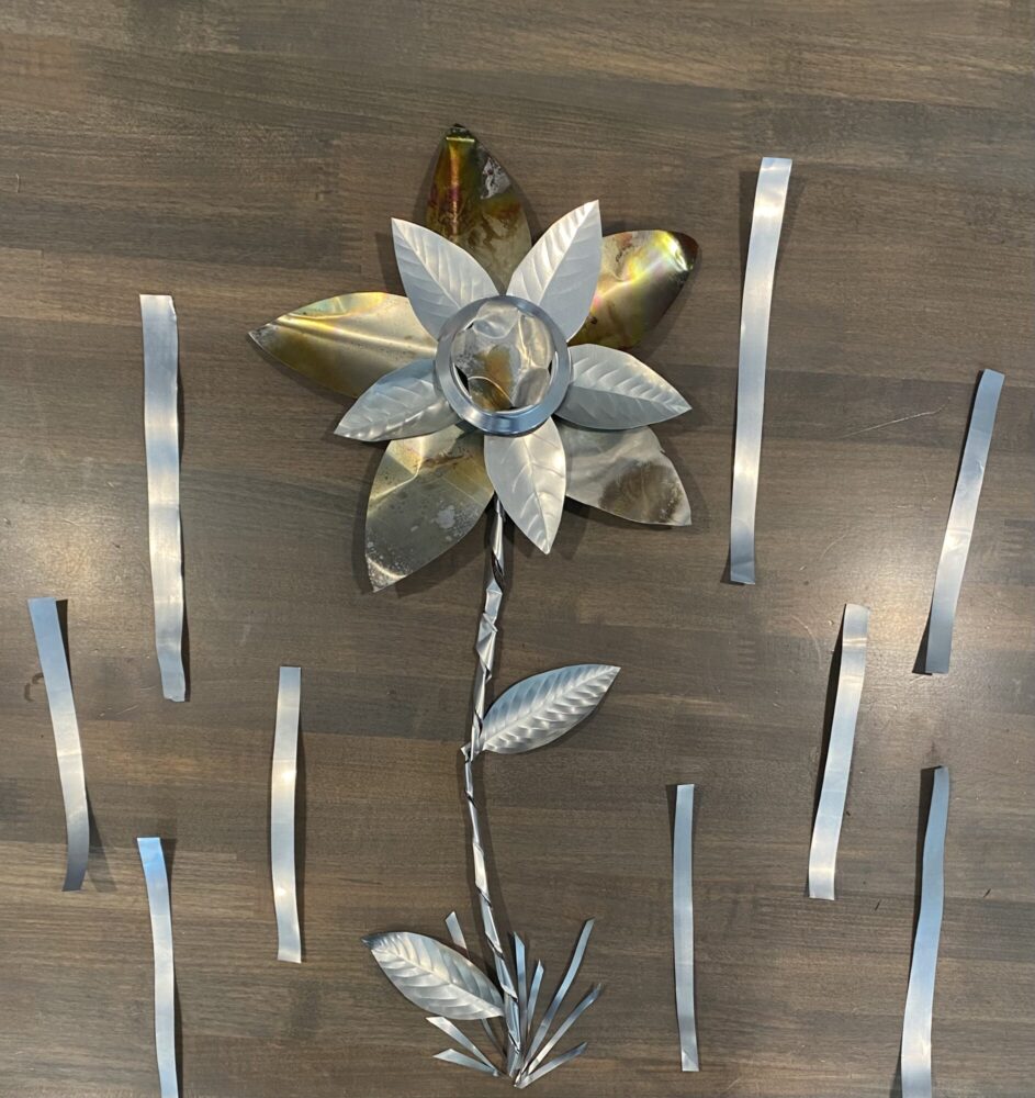 After experimenting with various textures, shapes, and colors, I began to favor a floral wall art piece—a design that incorporated all the techniques I had developed. This project was meant to reflect the organic forms found in nature while still capturing the abstract aesthetic that I had been exploring. I chose to make a set of flowers by cutting and shaping the aluminum into petal-like structures, layering them to create depth and movement. Each flower petal was textured or tempered in an inversely but (hopefully) complementary manner to enhance the texture and form of the design.