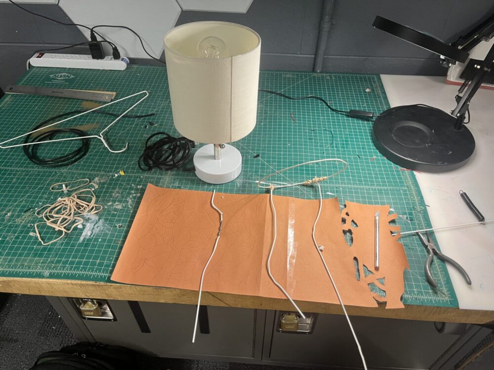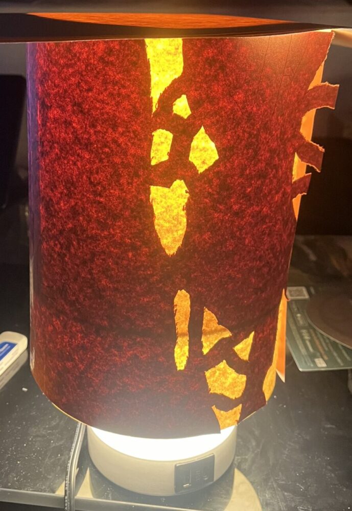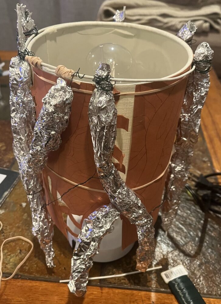 Following my initial design concept, I found a suitable lamp and lampshade from Goodwill. One issue I encountered was that the washer/ring used to center the lampshade on the lamp didn’t fit properly. To resolve this issue, I cut the ring that came pre-attached to the lampshade and replaced it (using superglue) with the washer/ring piece that came with the lamp. I then began fabrication of my project by replicating my sketched pattern onto a paper that I wrapped around the lampshade (figure 8). This was to get a general idea of how the final project/pattern may look, as well as provide a stencil to start creating the 3D root structure. Unfortunately, I discovered that using this fabric lampshade breaks up the light passing through it such that even when an object is placed directly on the lampshade, you can’t clearly make out a discernible illumination pattern. At this point, I chose to focus on creating the root pattern rather than troubleshooting the illumination problem.
