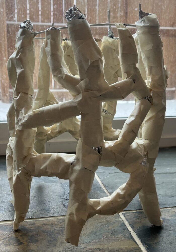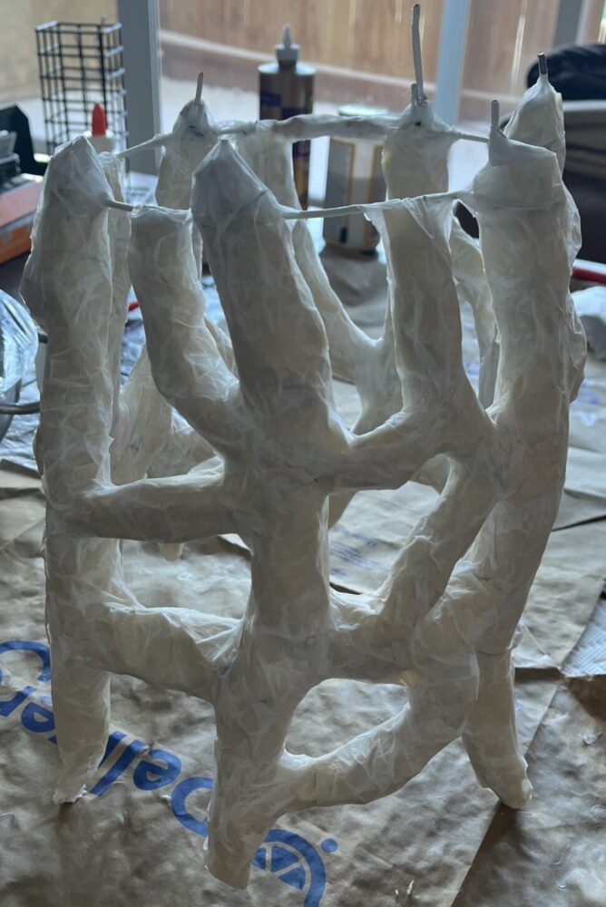 After wrapping the connecting roots in aluminum foil as well, the next step for my project was wrapping the structure in masking tape. The masking tape served the purpose of providing a good surface for the papier mâché to stick to (see figure 11). With the mold being finished, I created the paper mâché using white tissue paper and a mix of 1 part Elmer’s craft glue to 2 parts water, and layered it onto the roots (see figure 12).
