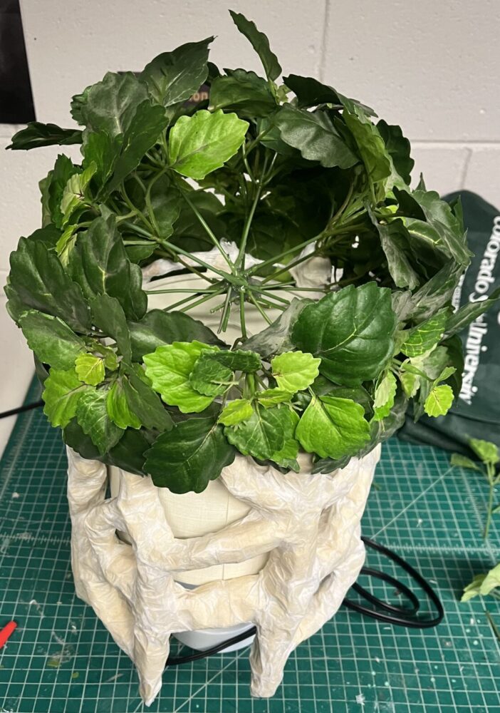Going forward, I would like to touch up the paint so that it isn’t a solid color (adding a bit more texture to the roots). Another change I want to add is fastening all three components together. Right now, all piece are resting around/on top of each other rather than being fastened together. This makes it a little difficult to transport and set up. Lastly, I want to alter the canopy stem connection because the hot glue connection point touches the top of the lightbulb.