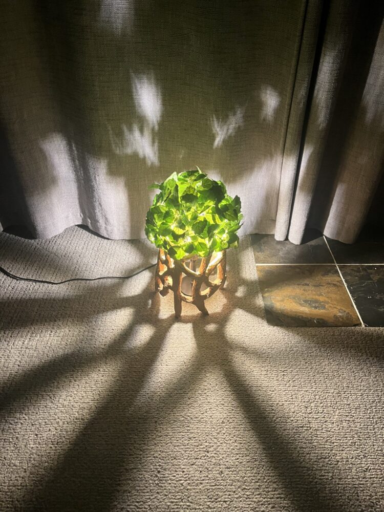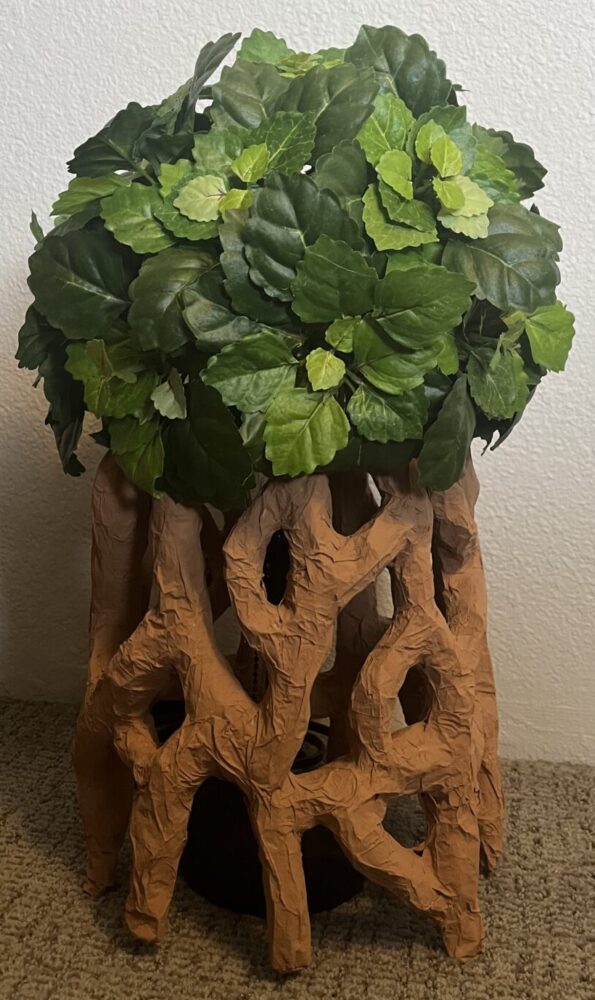My final design is shown in figures 15, 16, and 1 (the featured image). As described above (see figure 14), it’s comprised of a black painted lamp, brown painted papier mâché root structure, and artificial leaf canopy. I believe my design effectively represents a strangler fig tree as well as the beauty in death aesthetic both when the lamp is turned off and on, with the aesthetic being exaggerated when the lamp is on. Functionally, I’m very pleased with how the illumination pattern turned out. It still lets out enough light to properly work as a lamp if/when needed.