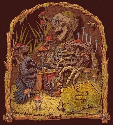 I define the beauty in death aesthetic as an appreciation and admiration of things related to or involving death. This aesthetic is typically displayed as some beautiful graphic that integrates some deathly, eerie undertone (with use of a skull, skeleton, etc.). An example of this aesthetic is shown above with figure 2. A reason as to why people may be drawn to this aesthetic is to serve as a reminder of the beauty in the finiteness/fragility of life. A modern example where you might encounter this aesthetic is the Día De Los Muertos holiday. Celebrated throughout most of Latin America, you’ll find people adorned in skeletal face paint, and outfits featuring intricate designs. The musical artist Chase Atlantic also coincidentally released an album titled “Beauty in Death”, illustrating this aesthetic as part of his album cover. Other related aesthetics include goblincore (see figure 3), appreciating the things in nature typically seen as less beautiful, and vulture culture, related to the collection and preservation of animal remains.