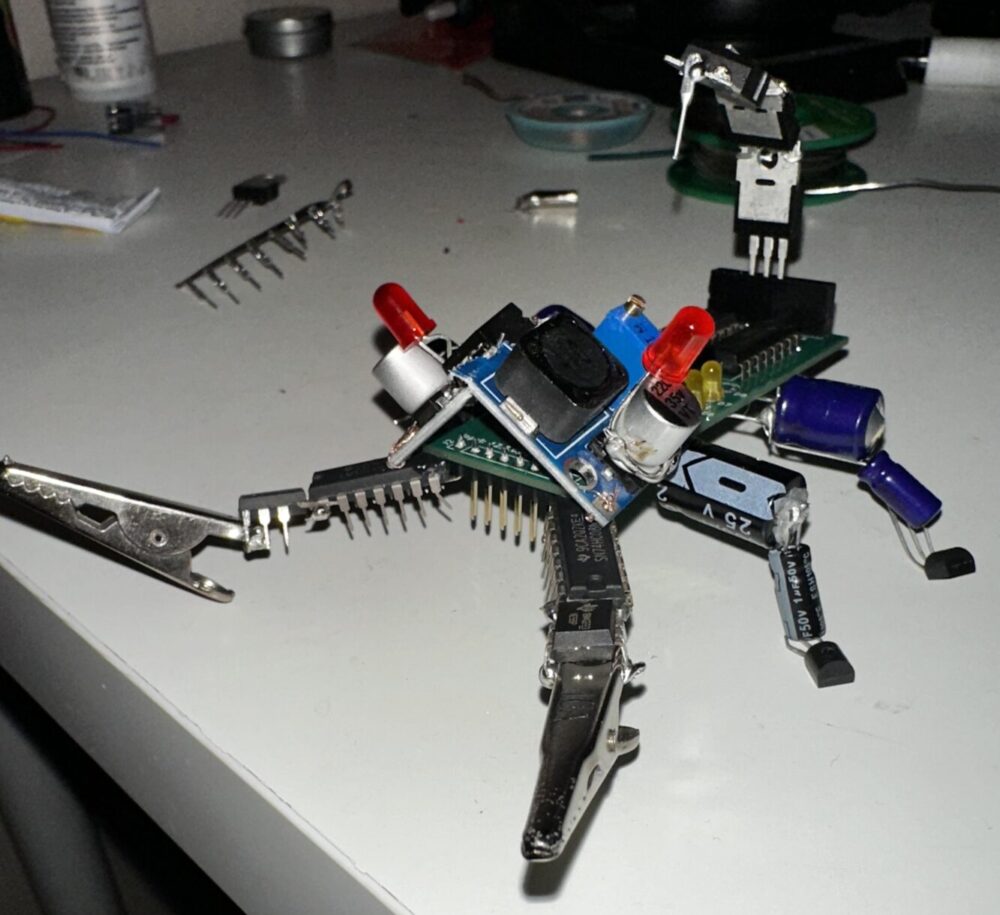 - Soldered varied-rating capacitors, BJT transistors and wires into leg-like appendages