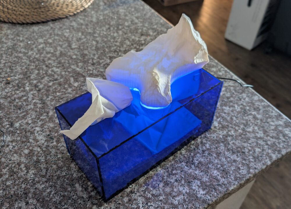 My initial functional goals were to create a lamp, tissue box, and artistic piece that I could put on a table and admire. As a lamp, it can change colors, brightness, and turn on/off with a controller glued to the back. While it is rather dim, it fills the purpose of being more of an aesthetic lamp then a functional one that you could use for reading. As a tissue box, I was satisfied by how well you could pull out tissues, and it can hold about 50 when full. An added bonus is that you can see the number of tissues you have left, so you know when you need to get more. Unfortunately, I did not incorporate an easy way to replace the tissues.
