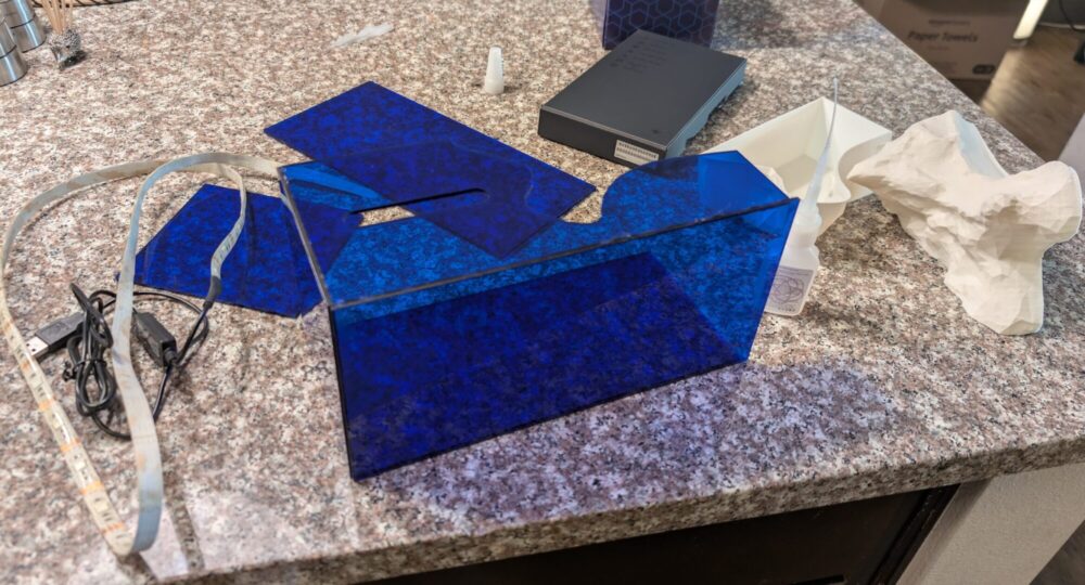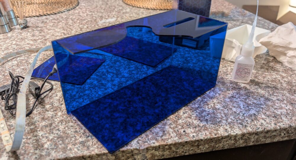 Once everything was manufactured, it was time for assembly. There are six individual acrylic pieces and two 3d printed pieces, along with an LED strip. To put all of these together I purchased a small bottle of specialized plastic glue, which would help to tightly bond all of the acrylic and ABS together. This was the one thing that I needed to go buy and not reuse, since the superglue I already had was not strong enough to bond with only and 1/8 inch thickness material to interface with.