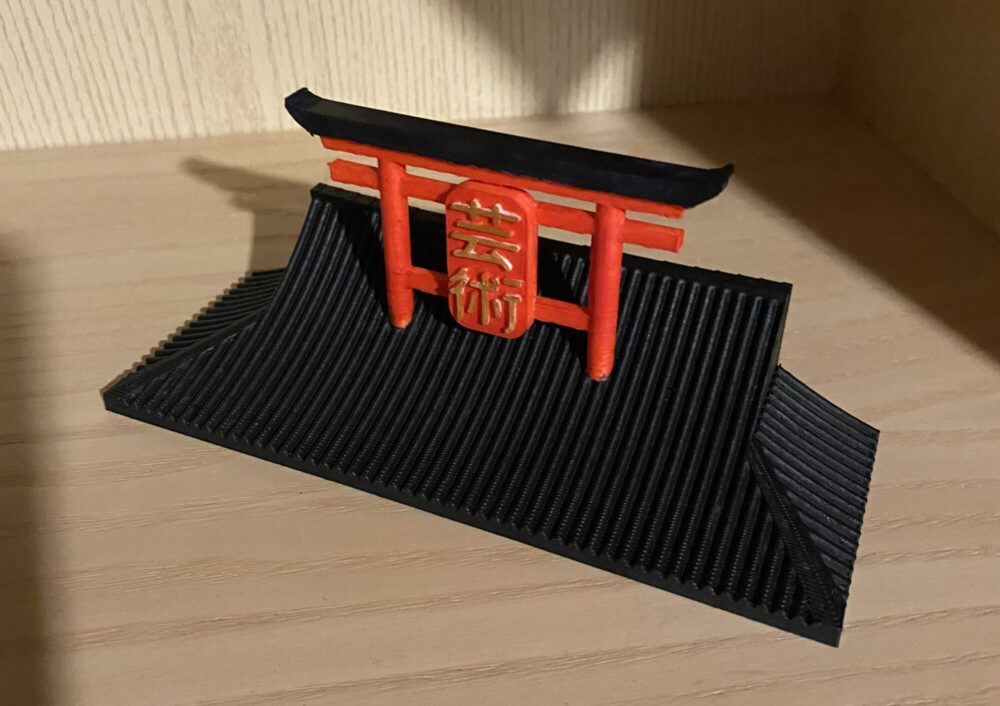 Overall, I decided to use the color “Vermillion” as a nice bright red with a hint of orange to cover the accents. The roofing color is a black-gray variant called “Payne’s Gray” with a hint of an olive green in there, but it wasn’t too visible in the final product. I painted the kanji a nice gold to give them a rich pop. Overall, my paint job is far from perfect, as the brush I was using was only so small, so many of the tiny details have imperfections and smudges. I would like to take a white paint to cover any of those, while also straightening out the red lines. But then I sanded the contact points between the layers and used a strong cyanoacrylate glue to connect them. Below you can see the final product.