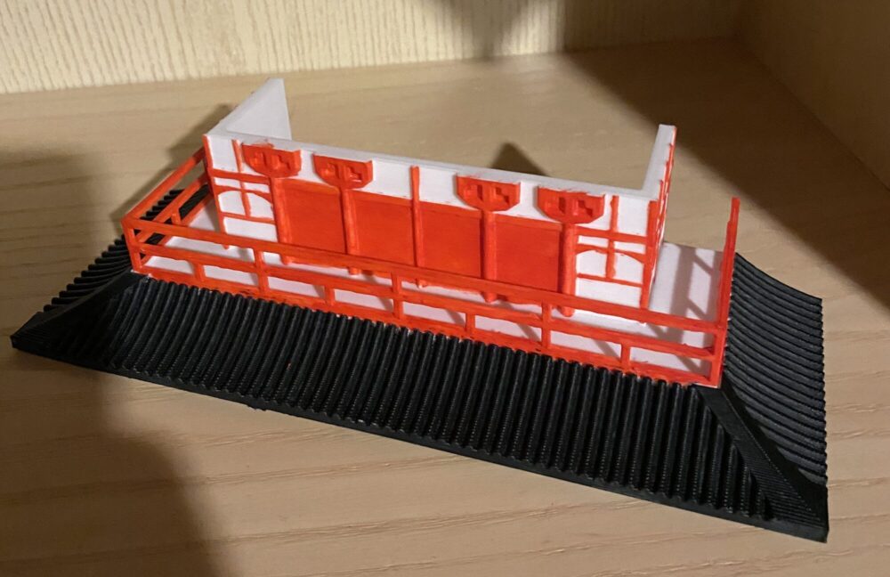 I printed this in three parts as mentioned above to save on support usage, corresponding to the base with the first walls, followed by the section from the first roof up to the second roof, and then the second roof with the Torii gate on top. Below are all three images of this, and they are already painted.