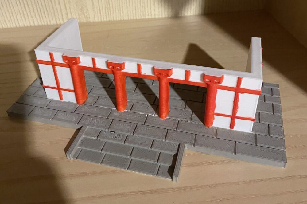 In terms of how it came out versus what I envisioned at the start, they are honestly quite close, barring some minor paint blemishes. It is quite a simple design, and given more time I would have liked to build out some more unique or complex parts or even making a larger design. I initially printed an even smaller first layer before deciding it wasn’t as large as I would like, so I increased the size by 30%. I think it could have done with being even larger, especially in the vertical direction. I never noticed it when doing the CAD but the building looks quite compressed, especially from a downward angle like this one. Adding more stories to it could solve this and make it look more regal and impressive. I also am reflecting on the contrast between the white print material and the red paint I chose, as I think those two colors together make it look quite “plastic-y”, and so I’m considering making the white walls more beige or altering the red accent color.