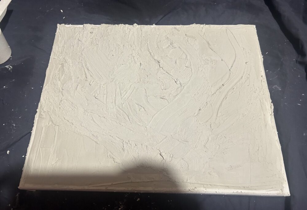 So, I mixed the plaster with some water and applied it to the canvas. Two significant problems with this: the plaster started to dry and harden in a minute or two, so I couldn’t sculpt it much after I initially applied it to the canvas. The second issue was that plaster doesn’t bond well with canvas, so I had to handle it until it was set to prevent it from chipping or coming off in one big sheet. I solved this by gluing the edges down, and that seemed to help, but until it was completely set, I had to be careful. Even though the plaster hardened relatively fast, it worked out in a way I liked because it allowed me to add layers. Initially, I just tried to cover the entire canvas in a smooth layer, and then as I said more and more plaster, I could “carve” the shave of the slope, and since I was applying it in different areas at different times, it made it more uneven which I liked. Even though I hadn’t sketched anything yet, you can see how I wanted the slope to funnel into the center of the canvas with the tree line on the corners guiding it as a channel. The corners are smoother than the rest of the slope, giving the trees a flatter texture.