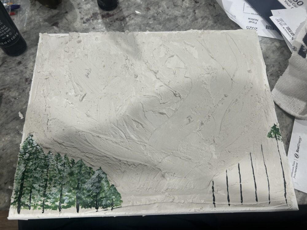 This is where I painted on the tree line. Some examples of this type of art didn’t include trees, but I wanted to add trees because they enhance the artwork by adding depth, contrast, and a sense of realism to the scene. Their dark, detailed forms break up the smooth, flowing texture of the plaster, creating a dynamic interplay between organic and sculptural elements. The trees provide visual balance while contributing to the illusion of depth, making the skiers appear to be weaving through a real mountain landscape rather than just a textured surface. This combination of texture, movement, and detail results in a blend of abstraction and realism. I tried to make the trunks thin to create an outline, but some showed through more than I’d liked. I used a blend of lighter and darker green to give it more abstract realism, with white on top to give it a snow-covered look. I even tried to add an even darker to frame the tops of the trees so you can see their shape so it doesn’t look like one blob, but I’m unsure if it’s noticeable. After it has dried, I’d like to add more snow; it’s too green.