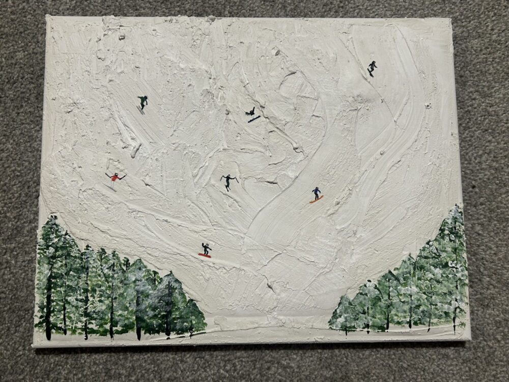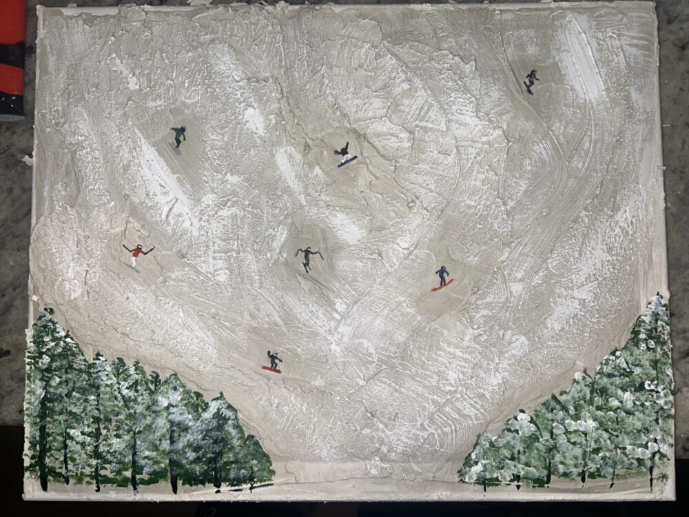 Once the plaster thoroughly dried, it turned completely white, which defeated the purpose of painting a little white over the top to show off the texture. However, once it became white, the texture became more visible as it was. It also made some of the skiers blend in a little more, which I’d like to go back and maybe highlight a little more so they’re more distinct. Overall, I’m pleased with how this turned out. I think I achieved my aesthetic of creating a textured art piece that utilizes the texture and look of one material to mimic and emulate the texture and look of another and combine the abstract look of the painting with the realism of the plaster and the natural look of the landscape.