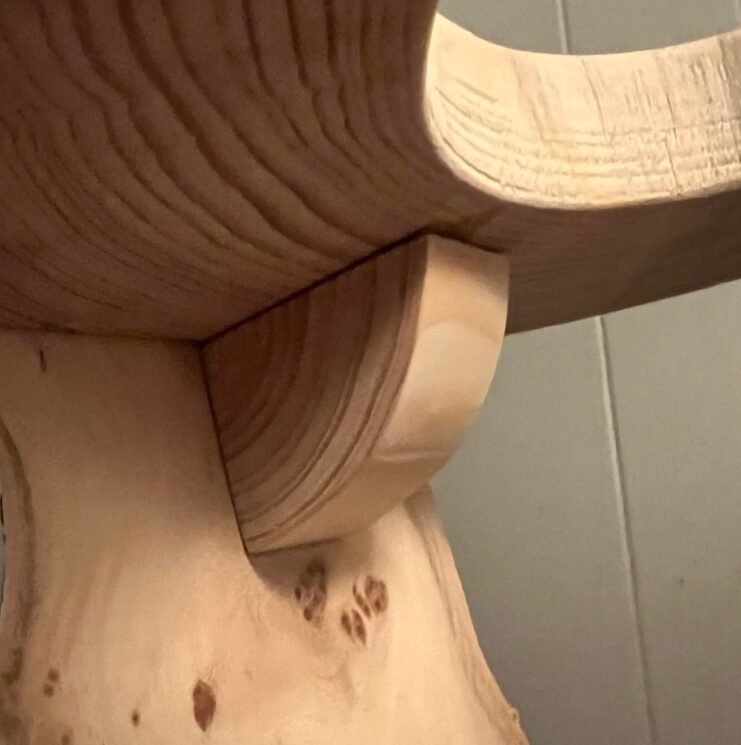 This final shelf consists of five individual shelves, each featuring holes designed to securely hold sports balls, preventing them from rolling off. This design not only solves the problem of balls constantly rolling around on the floor but also embraces the rustic aesthetic. One of my primary goals was to preserve the wood’s natural grain and features, which was successfully achieved in the final artifact.