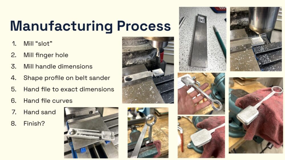 I will now summarize the manufacturing process. First, I milled the “slot” for the scoopy part of the spoon. This was the most difficult part so far because programming the rectangle was kind of strange with the unique dimensions of the slot. Also, the ball end mill leaves channels in the bottom of the scooper that I need to figure out how to smooth. The following week, I cut the big hole in the end of the handle using the mill again. This was relatively easy because the circle only needed a center point and radius to program it on the mill. Then, I milled two slots into where I wanted the final handle thickness to be. The next week, I continued these slots all the way down to above the finger hole and removed the scrap aluminum. This was followed by getting the final profile on the belt sander and then a few hours of hand filing to acheive the nice smooth curves and symmetric geometry. Finally, an hour or so of hand sanding was done, but I still need to put some more time into that to get it looking nice. Below is a screenshot of my manufacturing process slide from my final presentation.