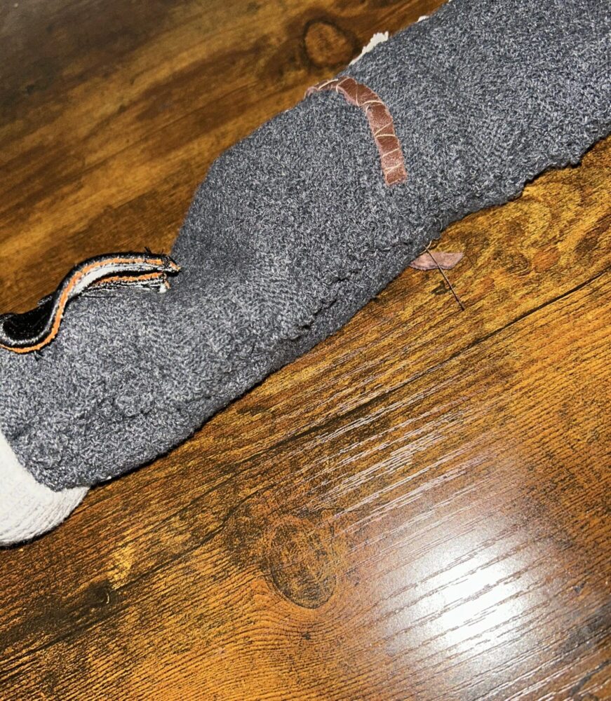 The patches I selected were thicker than expected, making them difficult to hand-sew through. Additionally, the sock’s loose-knit fabric made it challenging to keep the thread tight without altering the sock. This added to the patches not sticking onto the surface very well. -