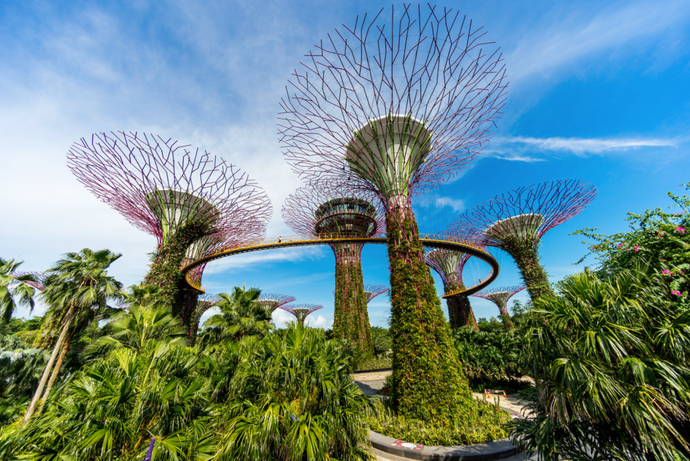 The Gardens by the Bay reflect the Solarpunk aesthetic with their blend of natural and futuristic elements. The artificial trees are lined with real foliage, and at night, they light up, creating a surreal, high-tech yet organic atmosphere.