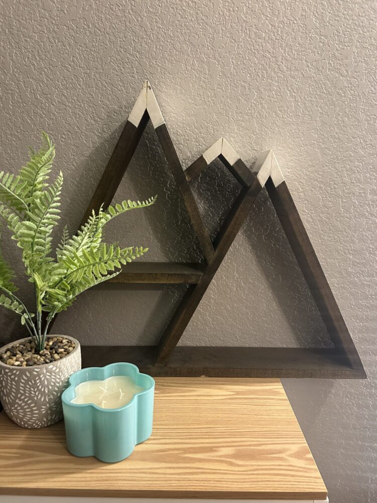 For a closer look at my original mountain shelf, see Figure 1. For this project, I used 1″x4″ boards that I will use again. I made the mistake of cutting at very difficult angles, and I have since learned the lesson and will not have to repeat it. I really like how I incorporated varying-sized peaks, and I will be doing this again. I debated on whether I would with the three peaks or not, and I discuss my final decision below. I really like the stain color and still have it, so I will be keeping it the same color.