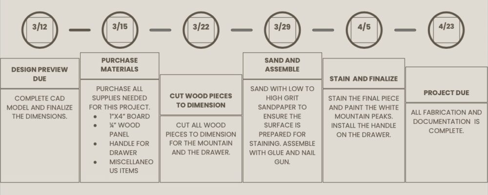 By 3/15, I will have bought all the materials I need for this project. I have already bought most of the items. By 3/22, I will have all the pieces cut to size. In order to complete this step, I will be using a miter saw that has the capability to be locked at various angles. Since the CAD model already has the angles and dimensions laid out, this step will be straightforward. I will need to ensure I make precise cuts so that all of the pieces align together. By 3/29, I will have all of the pieces sanded and assembled. For the sanding process, I have a sanding block and various sandpaper grits. I plan on using low to high sandpaper for this project to achieve a smooth surface finish. I will spend a lot of time on this step because it impacts how the stain will look. For the assembly process, I will be using construction adhesive in addition to a nail gun. This will ensure the joints are strong and the drawer will be able to hold sufficient weight. I will be using wood filler to cover the nail holes. By 4/5, I will have the piece stained and finalized with the final touches. For the staining process, I already have the stain and will be using a microfiber towel to apply the stain. I will let the stain dry overnight before I install the drawer handle. I will also be painting the mountain peaks white, the same as my original design. I also will add mounting hooks to the back to have the ability to hang it. By 4/23, the final product will be completed and all of the documentation will be complete.