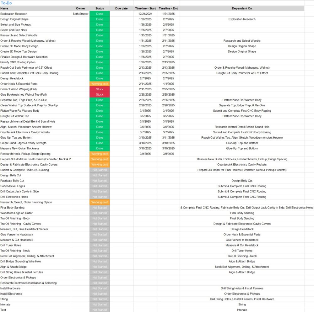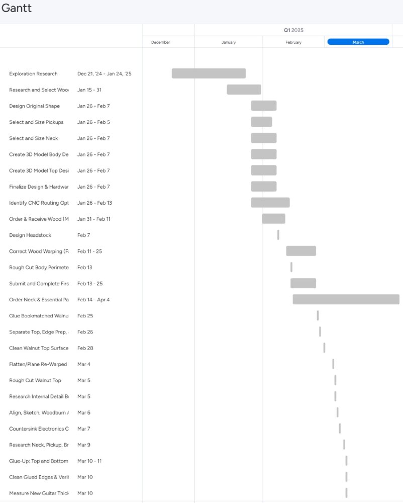 The extensiveness of this project makes it difficult to accurately project a timeline for fabrication. This is exaggerated by needing to wait for very unique parts orders and selecting an oil finish option that could require more than a dozen coats over multiple weeks and more time to properly set. My full intention is to carry this into the summer if the full product is impossible to finish before the semester’s design expo. At the very least, I’ll have all parts (body, neck, and headstock) built and ready for finishing prior to hardware installation and the final addition of pickups/electronics. The aesthetic, however, will be fully realized even at this pre-completion stage.