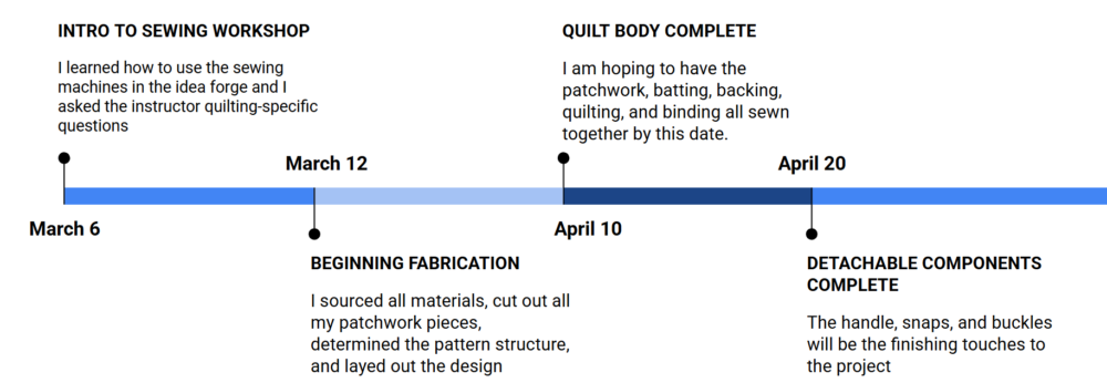 Below is a timeline detailing the major steps in my fabrication process. I am aiming to front load the majority of my work because once the end of the semester rolls around, I will be very busy. Plus, I want to leave a lot of wiggle room for iteration as needed.
