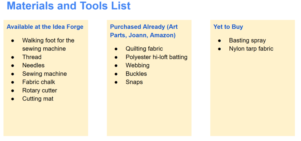 After finishing research into materials for this project, the next step was to source and buy materials. I took advantage of Joann’s closing sale and purchased 6 types of fabrics there. I also purchased 8 metal snaps at Joann. I supplemented materials at Art Parts, purchasing 4 additional scrap fabrics there. I was also able to find nylon webbing and two parachute buckles at Art Parts. Additionally, I ordered hi-loft batting on Amazon and it has arrived in the mail. Now, all that’s left to purchase is the batting spray and the waterproof ripstop nylon for the detachable tarp part of this blanket.