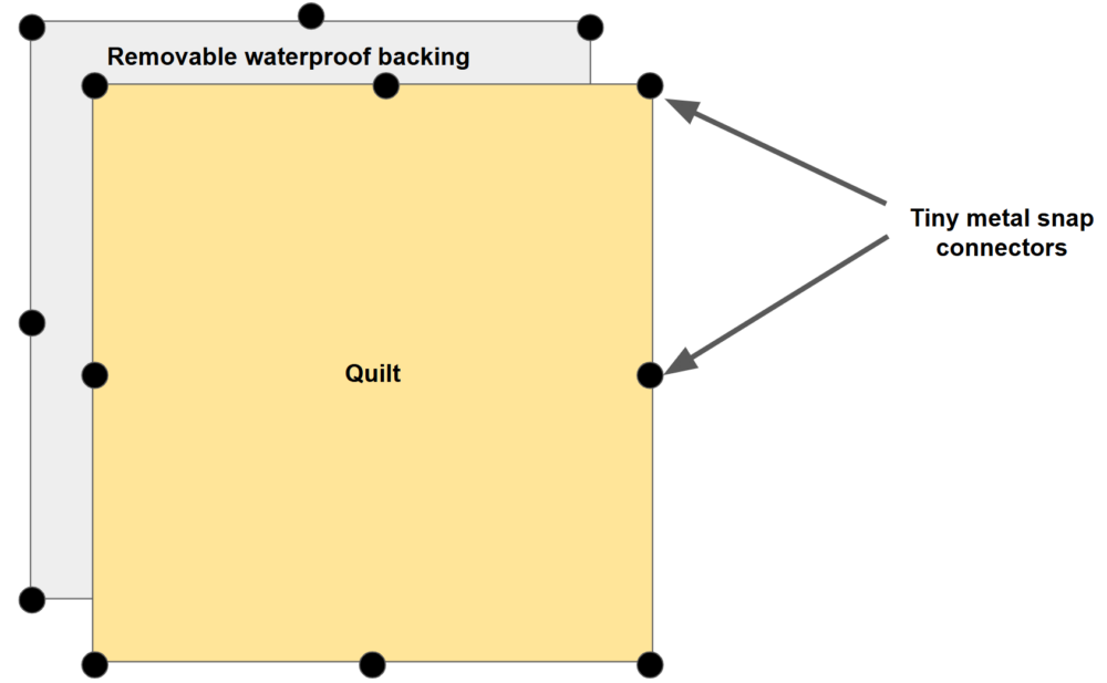 - Snaps in each of the corners of the blanket to attach a piece of waterproof protective material to the bottom, for use outdoors