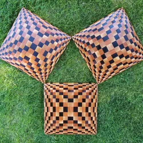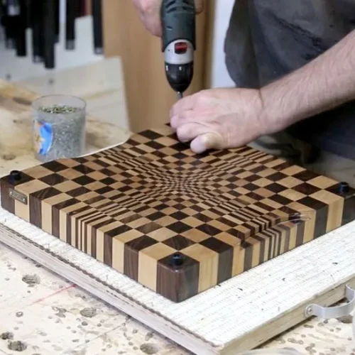 My primary inspiration comes from optical illusion wood patterns, particularly those that create depth and movement effects. I found several cutting boards with intricate illusions, some appearing to bulge or warp, and others featuring geometric arrangements that trick the eye. The first two images in my reference gallery depict bulge and pinch illusions, which I find particularly compelling. Optical illusion designs have long been used in art and design to create a sense of movement or three-dimensionality on a flat surface. These illusions rely on contrast, shading, and geometric precision to manipulate perception. I will be referencing traditional woodworking techniques as well as modern digital design methods to create my illusion.