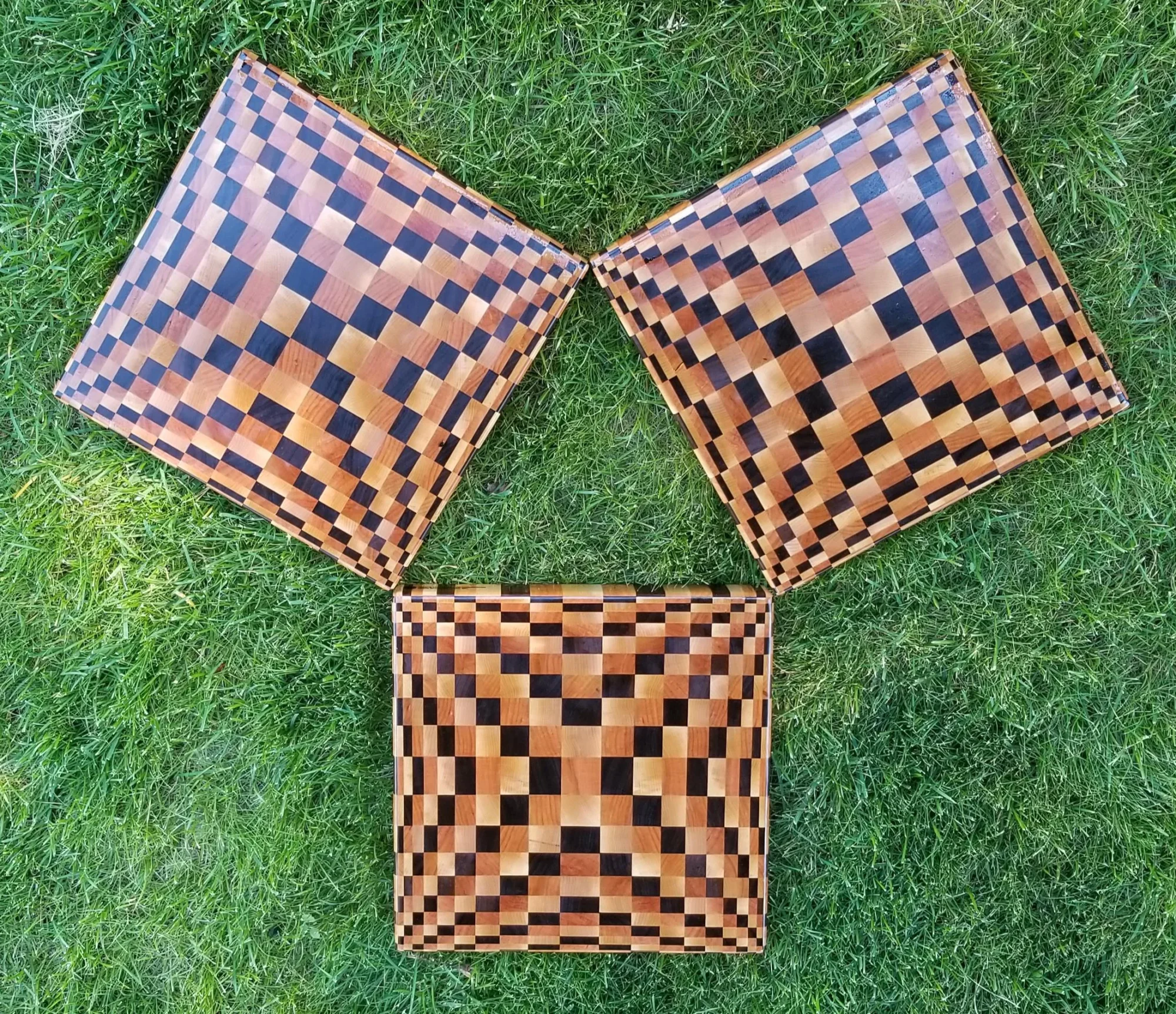 While many cutting boards use a simple striped or checkered pattern, my goal is to create a more complex optical illusion using rectangular pieces arranged in a grid. I plan to manipulate different wood sizes and color contrasts to enhance the illusion. This approach is adapted from the techniques used in optical illusion parquet flooring and inlay work. Optical illusions in woodworking often require careful planning and execution to ensure that the final design aligns correctly and maintains its effect from multiple viewing angles. The selection of woods with distinct color variation is crucial in achieving the desired contrast for the illusion to be effective.