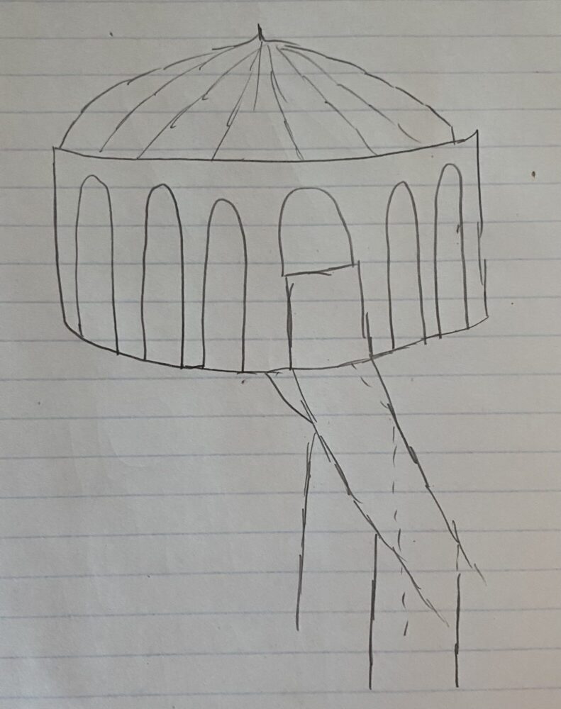 I started with trying to sketch something curved, as that fits a futuristic feel, and contrasts with the typical rigid and boxy nature of medieval architecture. What I drew looks quite like a cistern, inspired by the following image from bluefishds (5). Again, the dynamics I want to incorporate and the uncertainty regarding this aesthetic choice make me lean back towards the medieval design.