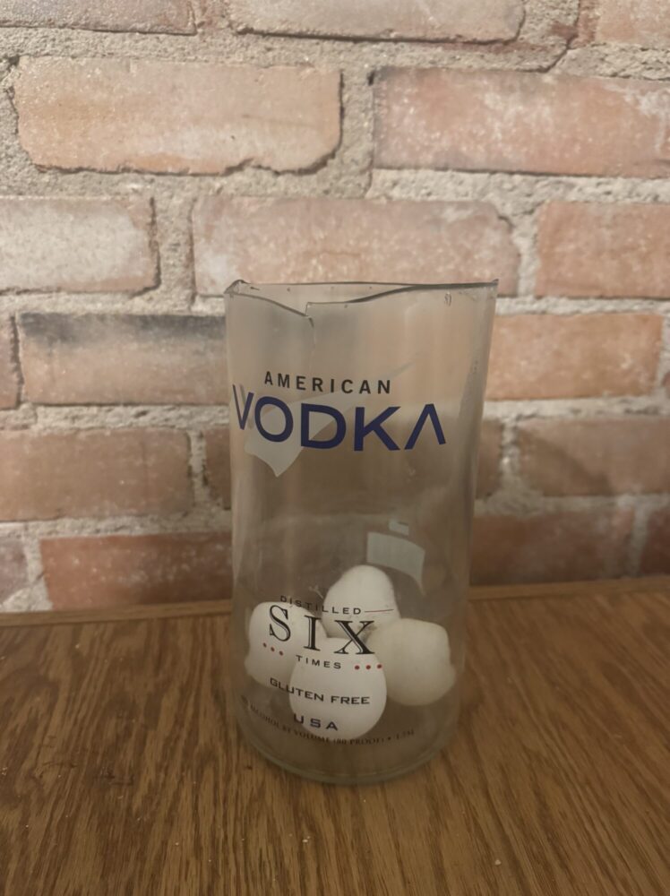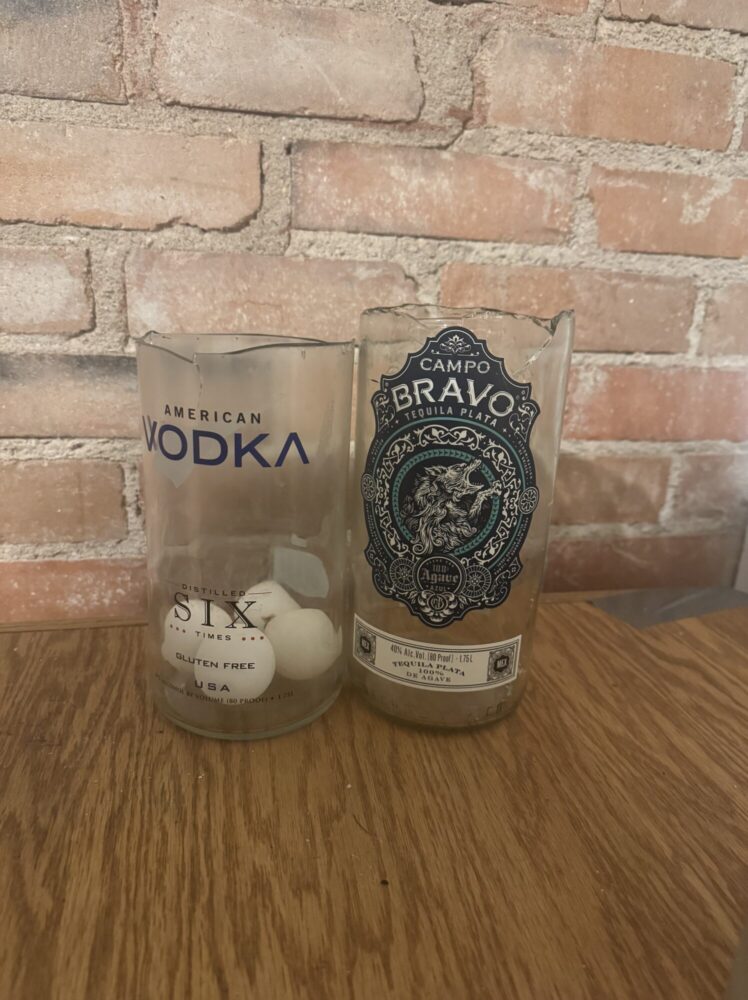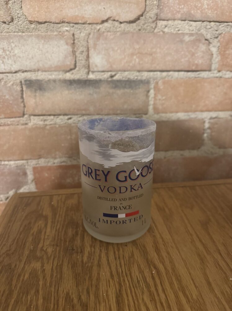 - One bottle successfully became a drinking glass – The Grey Goose bottle worked well for this purpose, with a relatively even cut and smooth edges after sanding.