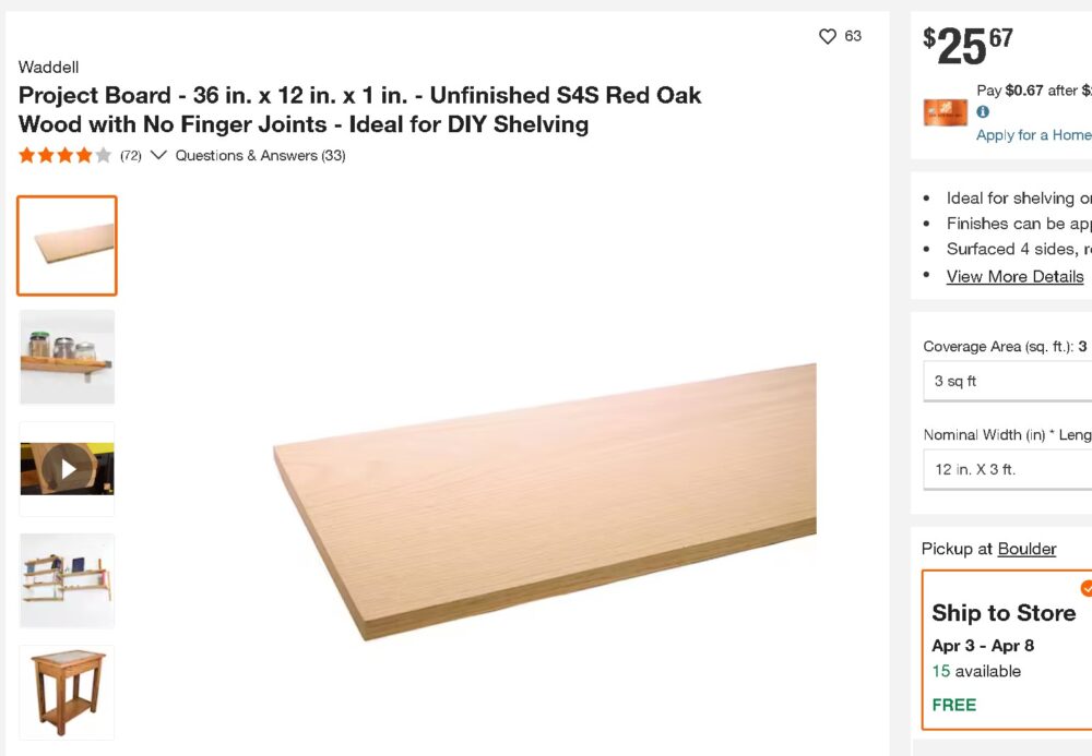 [1] https://www.homedepot.com/p/Waddell-Project-Board-36-in-x-12-in-x-1-in-Unfinished-S4S-Red-Oak-Wood-with-No-Finger-Joints-Ideal-for-DIY-Shelving-PB19544/203589203?source=shoppingads&locale=en-US&srsltid=AfmBOor2qhi-Jbb5_WEXRYuQN0ATo7Gyf20AaiNggfUQopFaHvyrHXDorjs&gQT=0#overlay